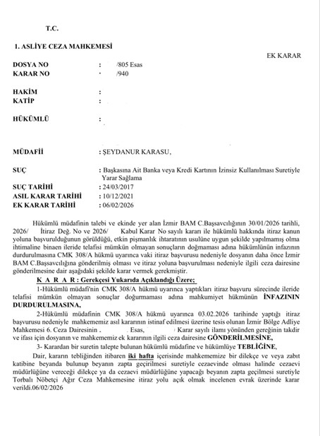 Bölge Adliye Mahkemesi C.Başsavcılığı tarafından 20/01/2026 tarihli 2026/İtiraz Değ. No ve 2026/ Kabul Karar No talebinde; “Katılanın talebi üzerine sanığın TCK 168 maddesi kapsamında zararı gidermesi ihtarını içeren 09.01.2020 tarihli celsede verilen karar gereği etkin pişmanlık kapsamında yapılan ilk tebligatın, tebligat kanununa göre sanığın 28.06.2018 tarihli 3.celsede mahkemede beyan ettiği Kuruçeşme mahallesi 205 sk no:78 iç kapı no:4 … … adresine çıkartılması yerine; Mernis adresi olan Konak/İzmir adresine tebliğe çıkartıldığı… 22.07.2025 tarihli Katılan … … şikayetten vazgeçme içerikli dilekçesi de birlikte değerlendirildiğinde bu eksikliğin hükmün esasını etkileyen bir eksiklik olduğu değerlendirildiğinden, … , 5271 sayılı CMK’nın 308/A maddesi uyarınca itiraz yoluna gidilmesi gerektiği kanaatiyle, …” şeklinde değerlendirme yapılmış ve ilgili ceza dairesinin kararına İTİRAZ edilmiştir.